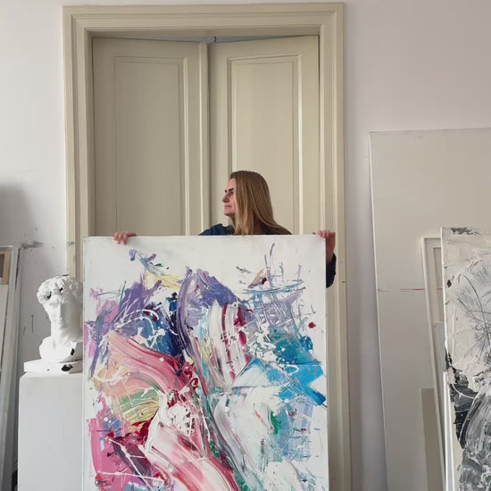 Abstract canvas painting in multicolor – EXPLOSIVE CALM (vertical)